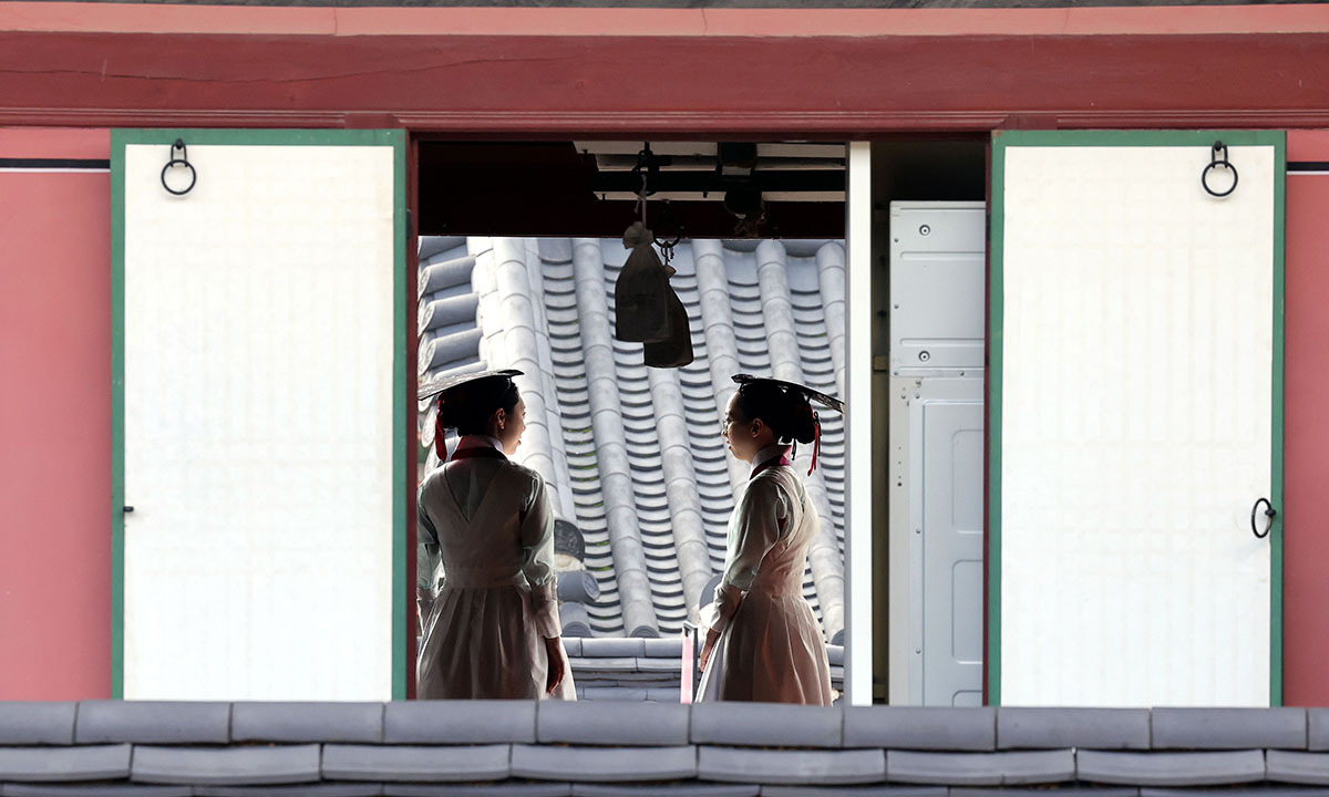 서울 창덕궁의 한 전각에서 열린 문 사이로 조선시대 의녀 복장을 한 약다방 직원 두 명이 마주 서서 대화를 나누고 있다. 흰색 저고리와 치마, 전통 머리 장식과 갓을 착용한 모습은 마치 과거로 시간 여행을 온 듯한 분위기를 자아낸다. 궁궐이라는 특별한 공간에서 차와 다과를 즐기며 특별한 시간을 보내보자./2025.10.02./이재문 기자