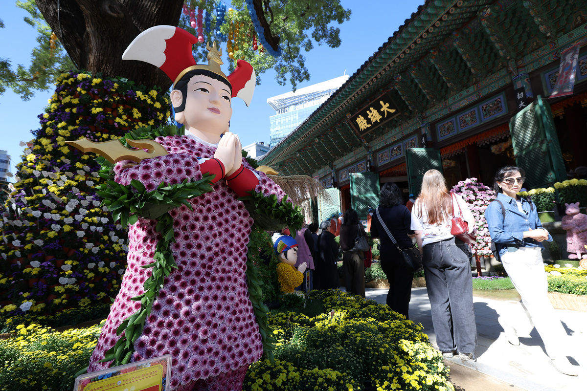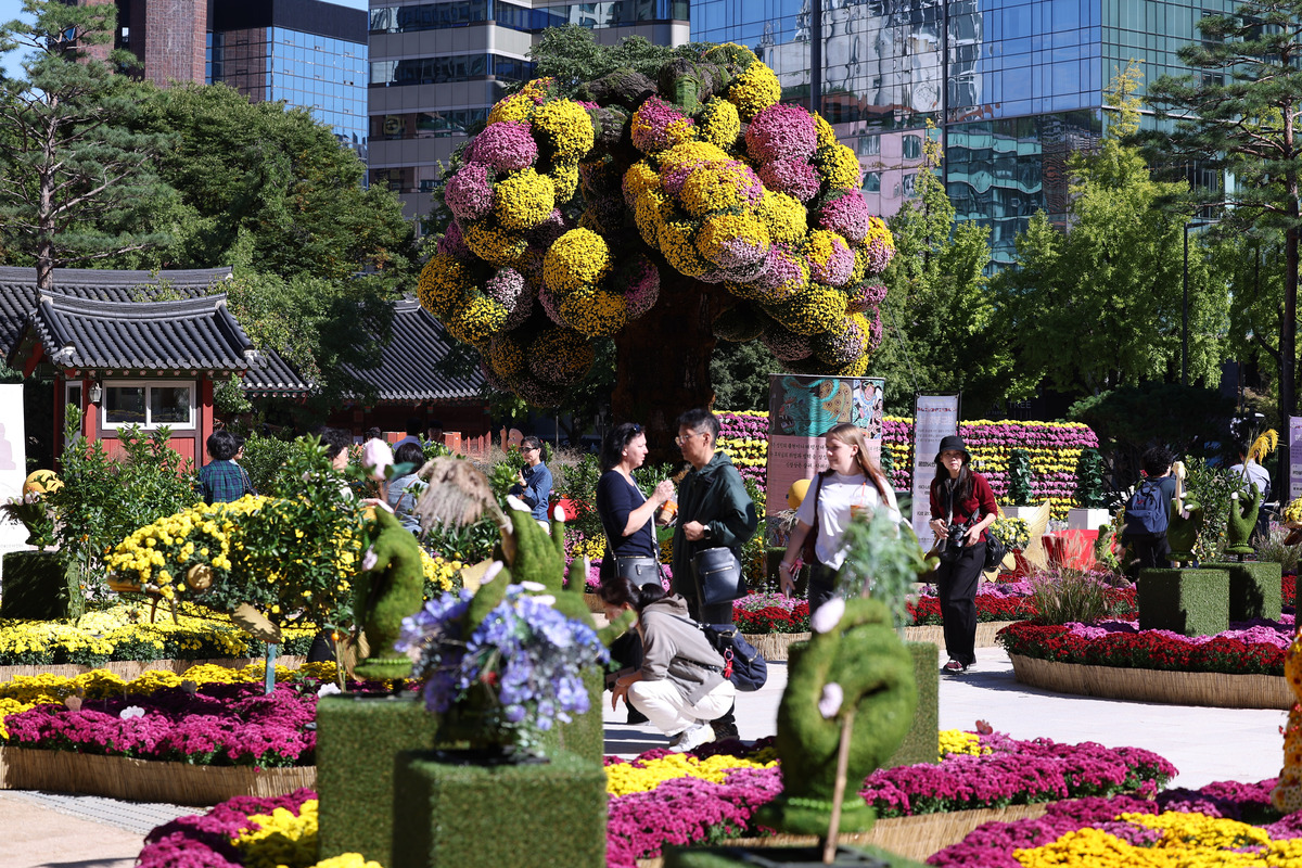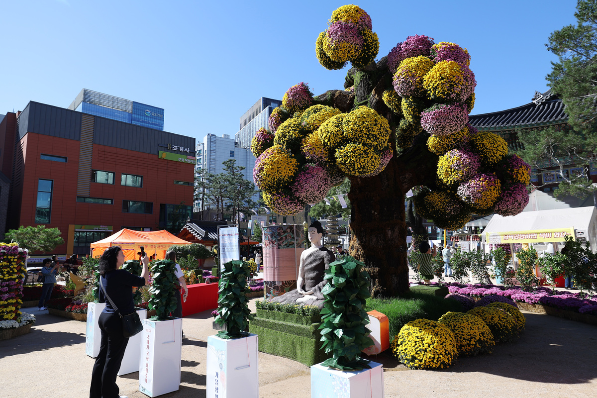 15일 서울 종로구 조계사에서 개최한 제15회 국화화엄축제를 찾은 방문객들이 설치된 국화를 보고 있다.