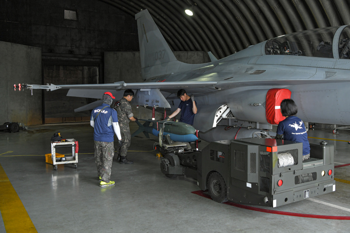 공군 지상요원들이 FA-50 경공격기에 한국형유도폭탄(KGGB)를 탑재하고 있다. 세계일보 자료사진