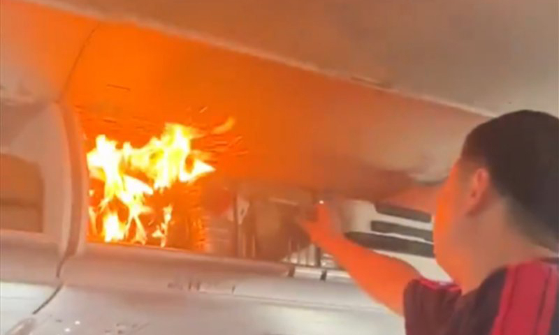 소셜미디어에 유포된 영상에는 기내 수하물 선반에 불이 붙자 승객들이 비명을 지르는 가운데 승무원들이 대응하는 모습이 담겼다.