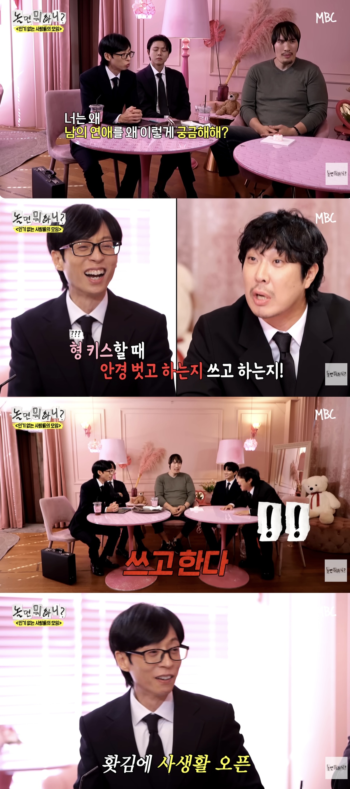 이때 하하가 “좀 더 자세히 듣고 싶다”며 연애사를 캐묻자, 유재석은 “넌 왜 그렇게 남의 연애에 관심이 많냐”고 핀잔을 줬다. 그러나 하하는 “난 형도 궁금하다. 형은 키스할 때 안경 벗고 하냐, 쓰고 하냐”라고 직설 질문을 던졌다. 이에 유재석은 “쓰고 한다!”라고 답해 스튜디오를 웃음바다로 만들었다.