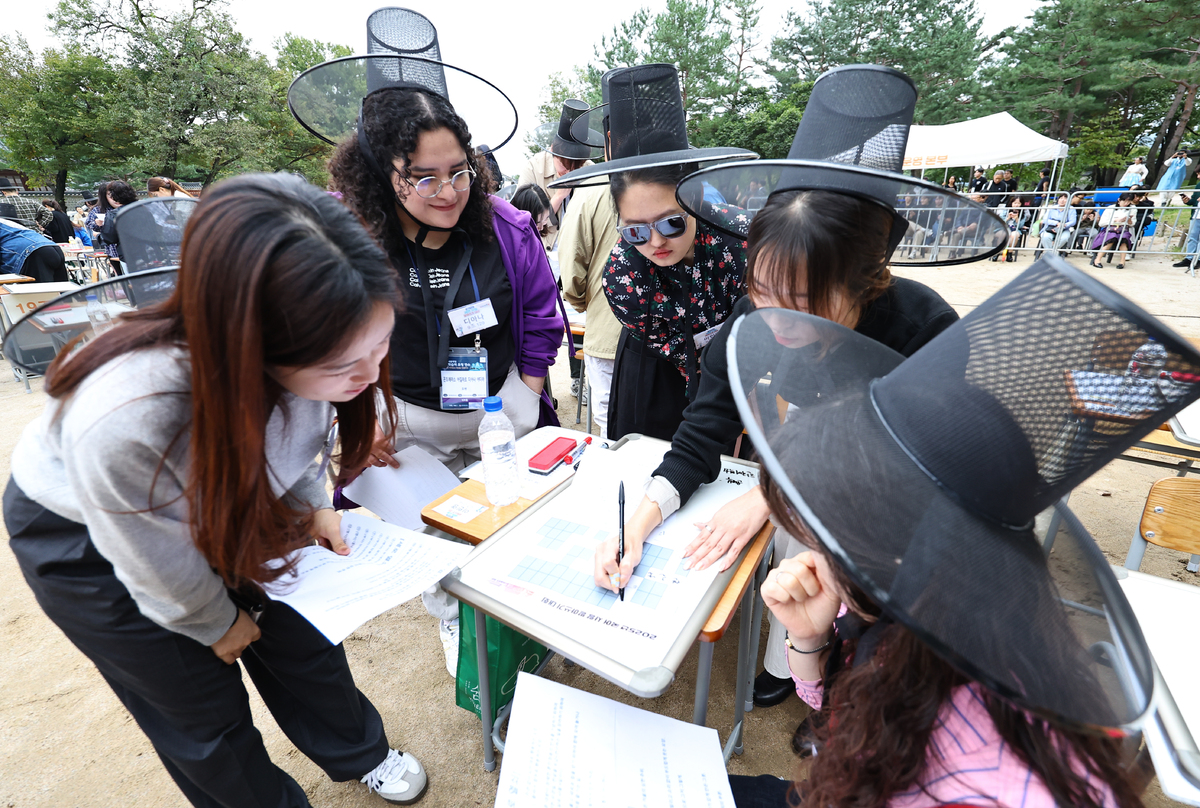 지난 10월18일 서울 경복궁 집옥재 앞마당에서 국립국어원 주최로 열린 ‘국어 사랑 받아쓰기 대회’에서 외국인 등 참가자들이 한글 실력을 겨루고 있다. 뉴시스