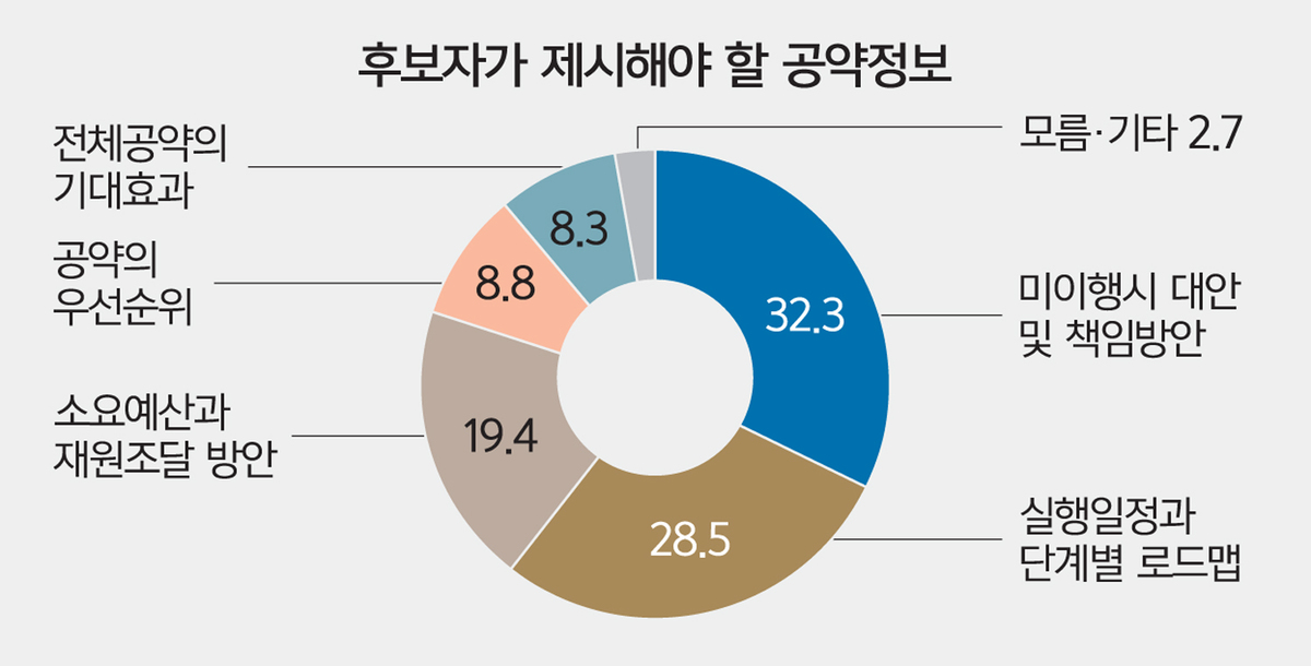 국민은 내년 6·3 지방선거를 앞두고 공약을 기반으로 투표하는 정책선거 문화 정착에 대한 높은 열망을 보였다. 국민 10명 중 9명은 정기적으로 공약을 점검하고 평가하는 제도를 상시화하기를 원했고, 현재 대통령 선거에만 있는 후보자의 주요공약 발표 의무화도 지방선거까지 확대해야 한다고 말했다. 선거의 승패를 가를 중도층은 공약 이행 여부에 가장 민감하게 반응하는 것으로 조사됐다.