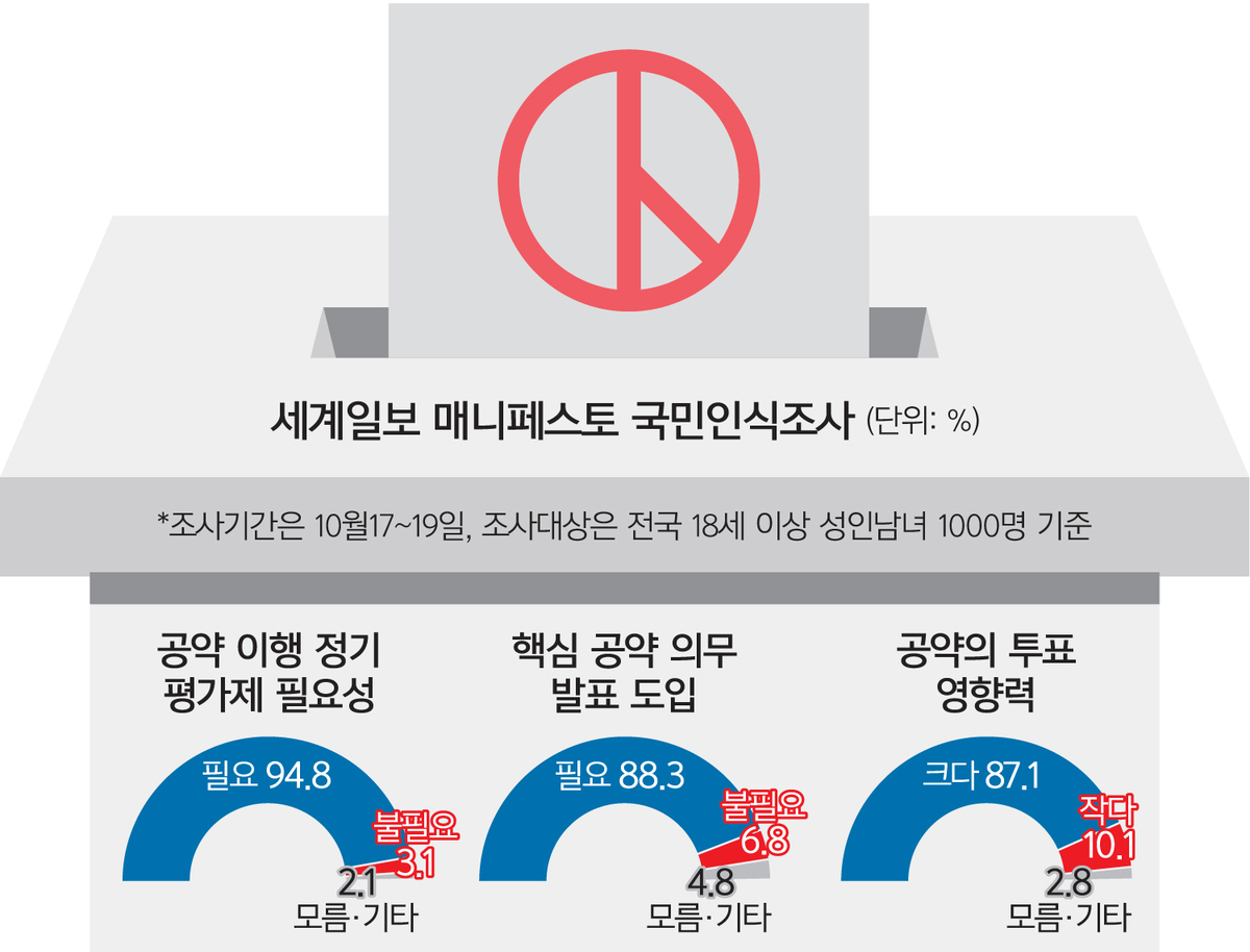 26일 세계일보·리서치뷰의 ‘매니페스토 국민 인식조사’ 결과에 따르면 대선과 지선 모두에서 당선자의 공약 이행을 정기적으로 평가하는 제도가 필요하다는 응답이 성별·연령·지역·이념성향 등을 가리지 않고 모든 계층에서 90%를 넘었다.