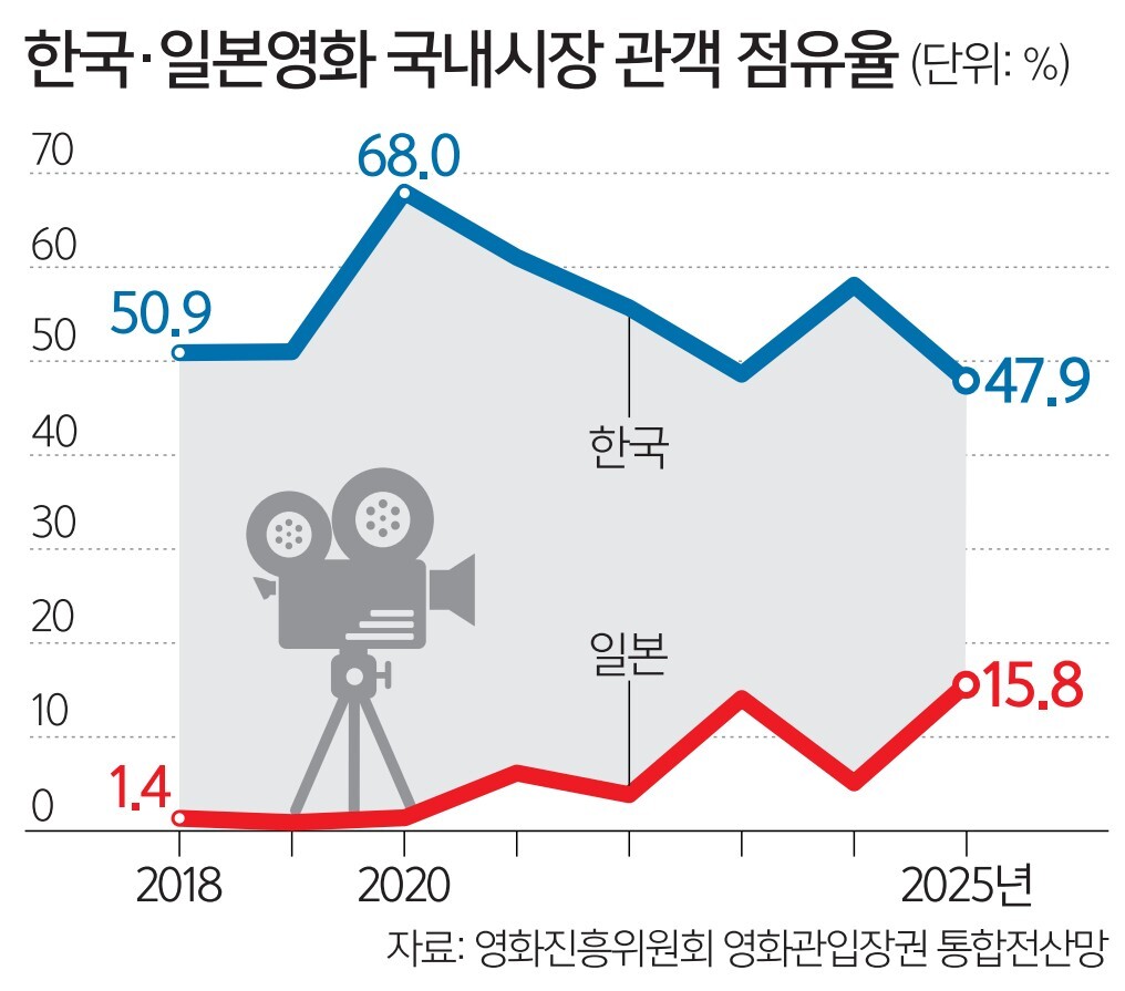 국내 박스오피스에서 일본 애니메이션의 약진은 한국 영화의 부진과 맞물려 나타났다. 2018~2020년 1% 내외였던 일본 영화 관객 점유율은 올해(10월 말 기준) 15.8%로 급등했다.