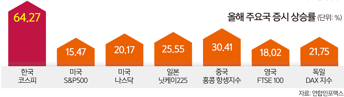 이런 대내외적인 요인에 힘입어 올해 코스피 상승률은 주요 국가 지수 중에서도 가장 가파른 것으로 나타났다. 코스피는 연초 대비 64.27%가 급등했다. 주요 20개국(G20) 증시 중 유일하게 60%대 수익률을 기록했다. 같은 기간 일본 닛케이225(25.9%)나 홍콩 항셍지수(30.41%), 영국 FTSE 100(18.02%), 독일 DAX(21.75) 지수를 압도했다. 연일 최고가를 경신한 미국 S&P500(15.47%)이나 미국 나스닥(20.17%)은 상대적으로 상승률이 저조했다. 코스피가 글로벌 증시 상승 흐름을 따라가면서도 한국 증시의 재평가가 이뤄졌기 때문이라는 평가가 나온다.