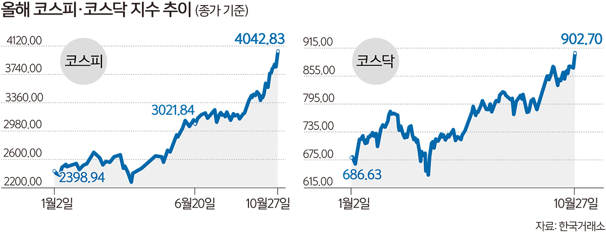 코스피가 27일 전인미답의 4000선에 올라서면서 꿈의 지수인 ‘오천피’(코스피 5000) 여정이 본격화했다는 평가가 나온다. 올해 2200선까지 후퇴했던 코스피는 대형 기술주가 상승 흐름을 주도하며 지수를 끌어올렸다. 인공지능(AI) 수요 확대에 힘입어 반도체 종목을 중심으로 랠리가 이어졌고 정책 지원과 글로벌 유동성이 확대된 환경이 수급을 뒷받침했다. 무역갈등과 관세협상 등 대외 변수가 여전한 만큼 변동성이 확대할 수 있다는 경계론도 대두하고 있다.