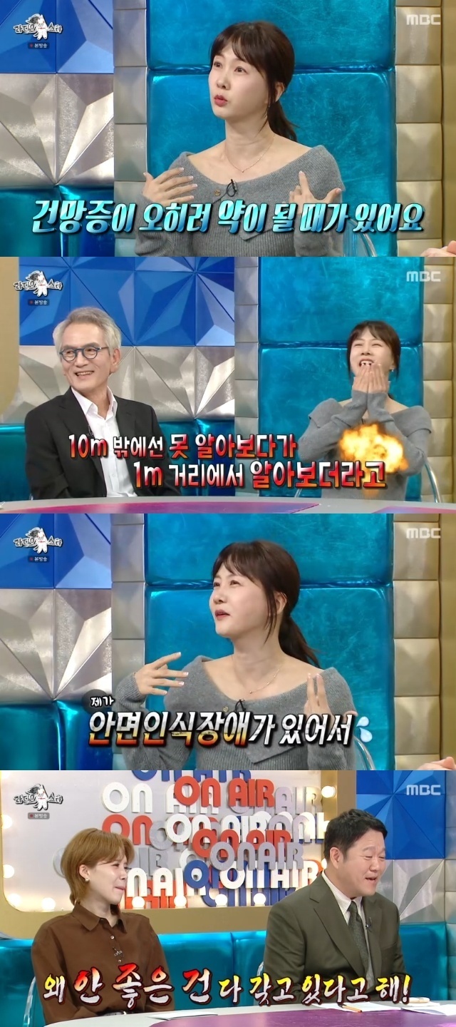 이에 김국진은 "10m 밖에서는 못 알아보다가 1m에서 알아보더라"고 덧붙이자 박소현은 "안면인식장애가 있어서 그렇다"고 고백했다.