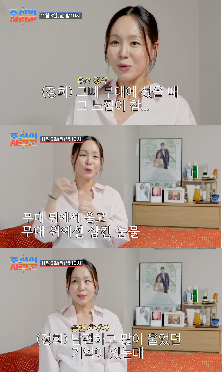 그는 “그런 순간들이 너무 힘들고, 중간중간 무대 뒤에서 울었다”고 회상하며, 당시 무대에서 느꼈던 복잡한 감정을 솔직하게 전했다. 이어 “공연 후에야 남편하고 많이 울었던 기억이 있다. 무대에 섰을 때, 그 느낌이 참...말을 못 하겠다”라며 감정이 북받쳐 한동안 말을 잇지 못했다.