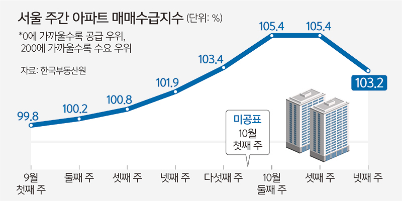 2일 한국부동산원의 주간 아파트 수급동향에 따르면 10월 넷째 주(27일 기준) 서울 아파트 매매수급지수는 103.2로 전주(105.4)보다 2.2포인트 하락했다. 8월 셋째 주(99.1) 이후 처음으로 하락 전환한 것이다.