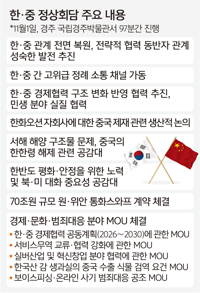 위성락 대통령실 국가안보실장은 한·중 정상회담 후 기자회견에서 “한·중 간 민생분야 실질 협력 강화 방안 등 다양한 현안에 대해 심도 있는 논의가 있었다”고 설명했다. 한·중 고위급 정례소통 채널 가동, 수평적 협력에 기초한 호혜적 협력 추진 합의 등도 성과로 꼽힌다.