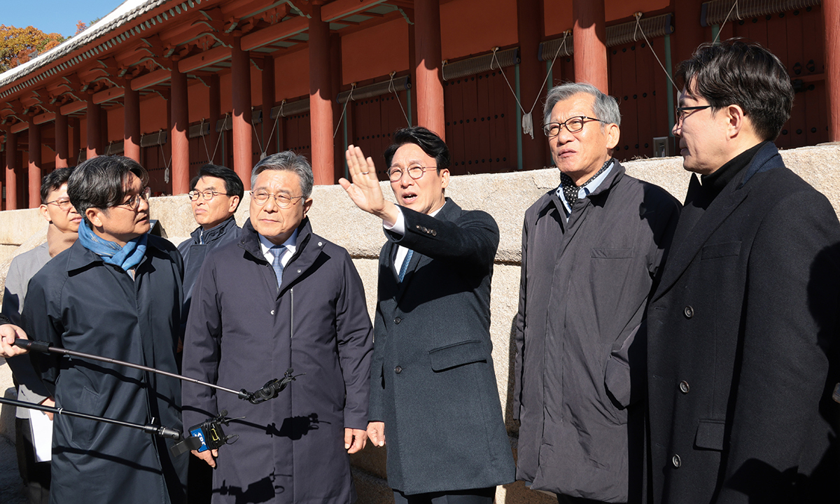 외부 조망 등 점검 김민석 국무총리(가운데)가 10일 허민 국가유산청장(왼쪽 두 번째), 유홍준 국립중앙박물관장(〃네 번째) 등과 함께 서울 종로구 종묘를 찾아 외부 조망 등을 점검하고 있다. 김 총리는 서울시가 추진 중인 종묘 인근 고층 재개발 계획에 대해 “서울시에서 일방적으로 밀어붙일 수 있는 사안이 아니다”라고 우려를 표했다. 뉴시스