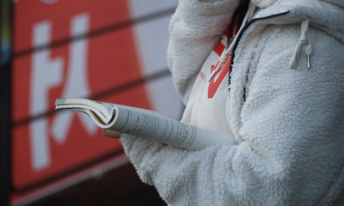 2026 수능이 치러지는 13일 대전교육청 27지구 제12시험장인 둔원고에서 한 수험생이 부모를 기다리며 참고서를 놓지 못하고 있다. 연합뉴스