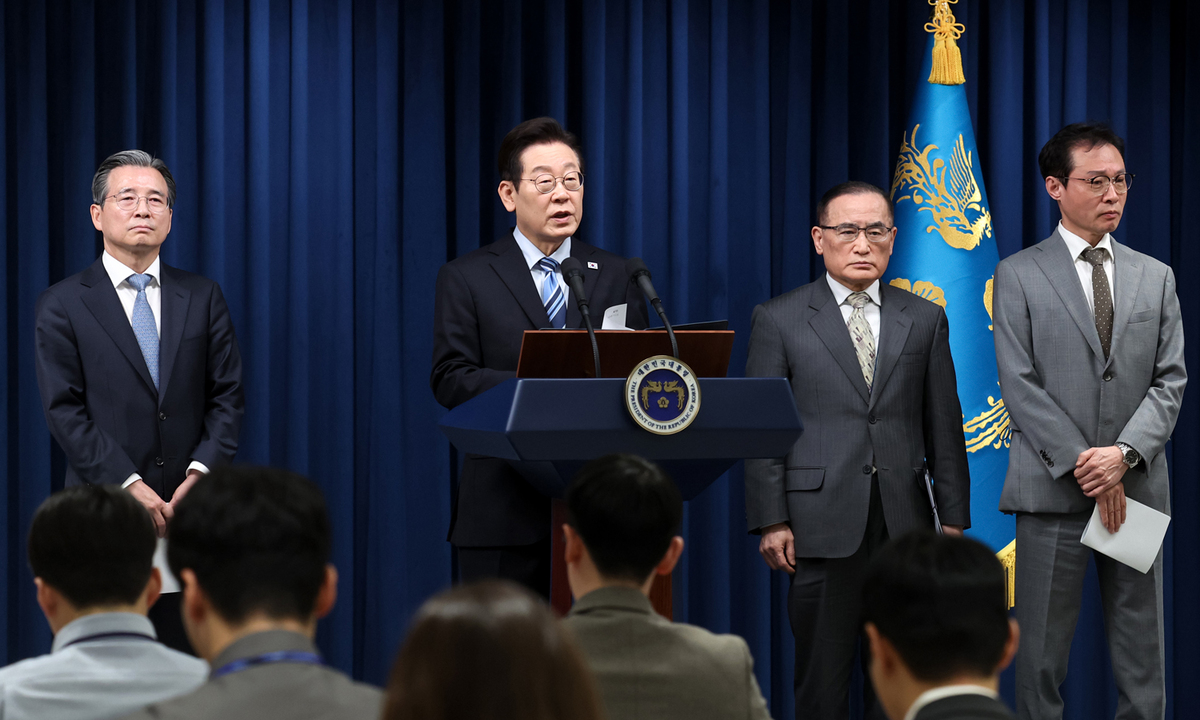 이재명 대통령이 14일 서울 용산 대통령실 기자회견장에서 한미 팩트시트 타결과 관련 발표를 하고 있다. 왼쪽부터 김용범 정책실장, 이재명 대통령, 위성락 국가안보실장. 이규연 홍보소통수석. 대통령실사진기자단