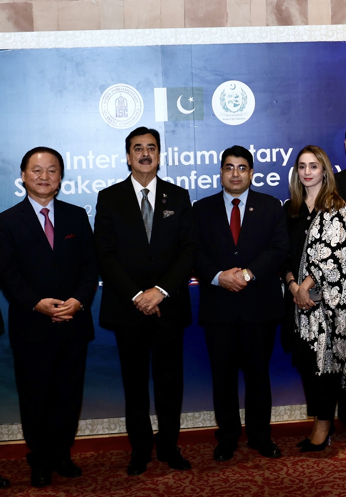 국제국회의장회의(ISC)에 참석들이 파키스탄 대통령궁에서 기념촬영을 하고 있다. 맨 앞줄 왼쪽에서 6번째 앉은 이가 파키스탄의 길라니 상원의장이고, 그 옆이 자르다리 대통령이다. 뒤 벽면의 사진은 파키스탄 건국의 아버지 무함마드 알리 진나 초대 총독이다. 이번 회의에는 40개국 국회의장들이 참석했다.