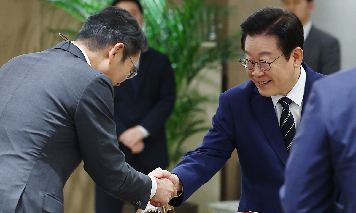 이재명 대통령이 16일 용산 대통령실에서 열린 한미 관세협상 후속 민관 합동회의에서 이재용 삼성전자 회장과 인사하고 있다. 연합뉴스