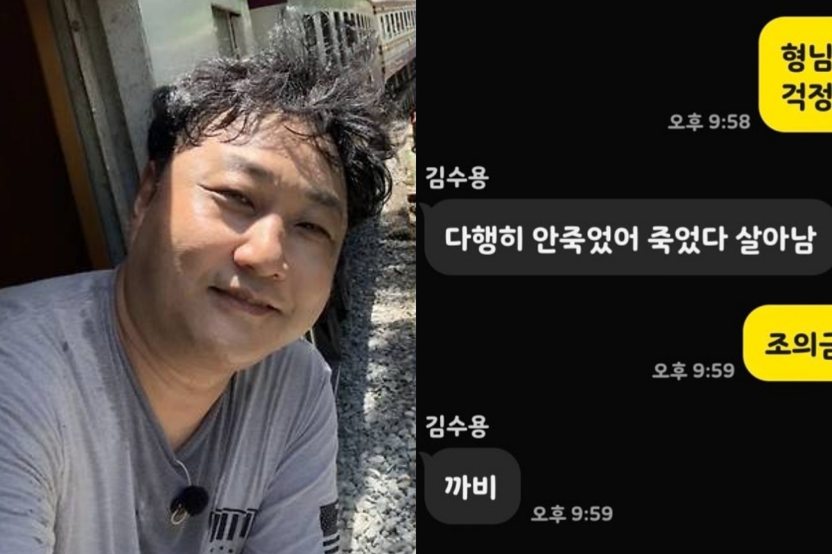 메시지 캡처본에 따르면 윤석주는 "형님 괜찮으신 거죠? 걱정 되네요"라고 안부를 물었고, 김수용은 "다행히 안 죽었어. 죽었다 살아남"이라고 답했다.