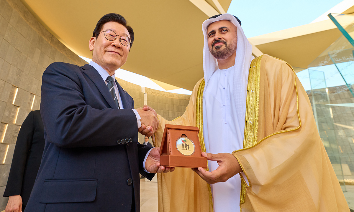 이재명 대통령이 17일(현지시간) UAE 현충원인 '와하트 알 카리마'를 방문해 디얍 대통령 직속 개발·보훈 사무국 부의장으로부터 기념메달을 받은 뒤 악수하고 있다. 공동취재 제공