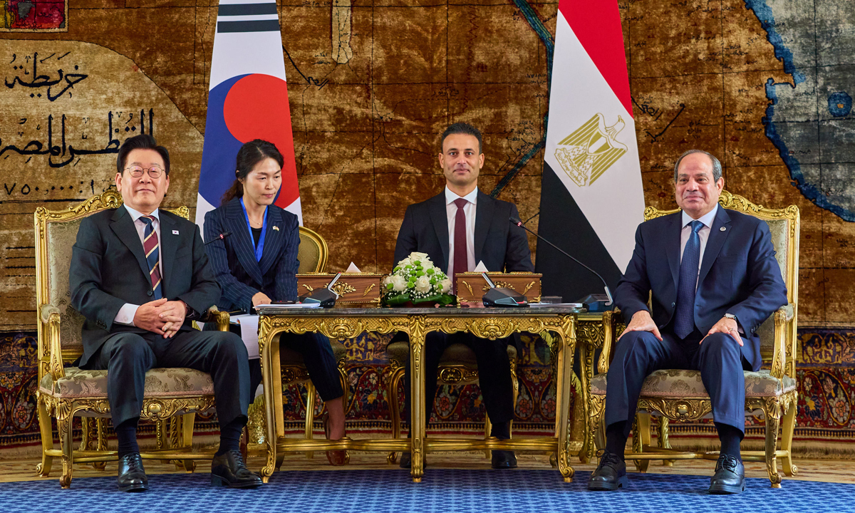 이집트를 공식 방문한 이재명 대통령이 20일(현지시간) 카이로 대통령궁에서 압델 파타 알시시 대통령과 한·이집트 확대 정상회담을 하고 있다. 대통령실 제공