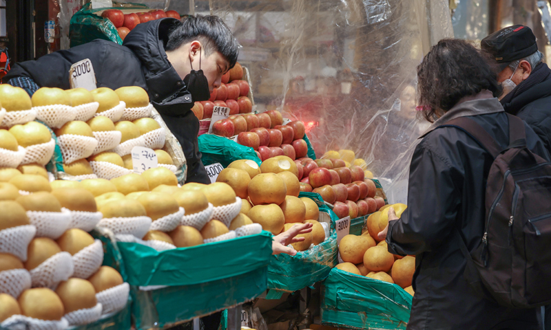서울 동대문구 청량리 청과물시장에서 시민들이 사과와 배를 구입하고 있다. 뉴스1