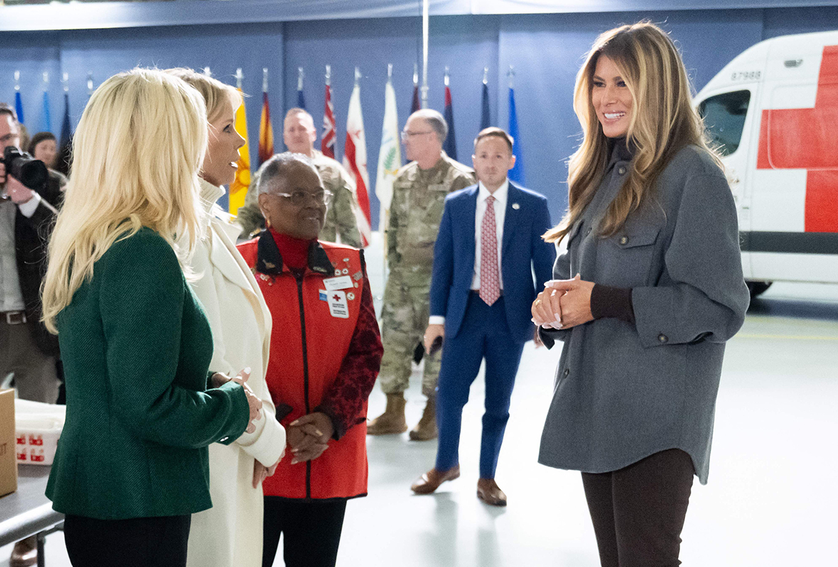 1일(현지시간) 도널드 트럼프 미국 대통령 부인 멜라니아 트럼프 여사(오른쪽)가 군 부대 장병 및 그 가족들을 위한 봉사 활동 현장에서 참가자들과 대화하고 있다. 왼쪽에서 두 번째 하얀색 외투를 입은 여성이 보건복지부 장관의 부인 셰릴 하인즈다. AFP연합뉴스