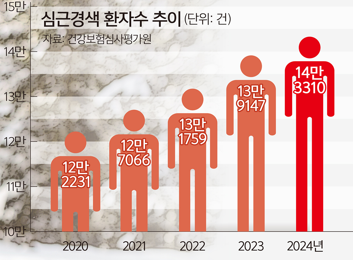 7일 건강보험심사평가원에 따르면 2020년 12만2200여명이던 심근경색 환자는 지난해 14만3300여명으로, 5년 새 약 17% 증가했다. 고령화와 함께 고혈압·당뇨병·이상지질혈증, 서구화된 식습관과 운동 부족이 복합적으로 작용한 결과로 분석된다.
