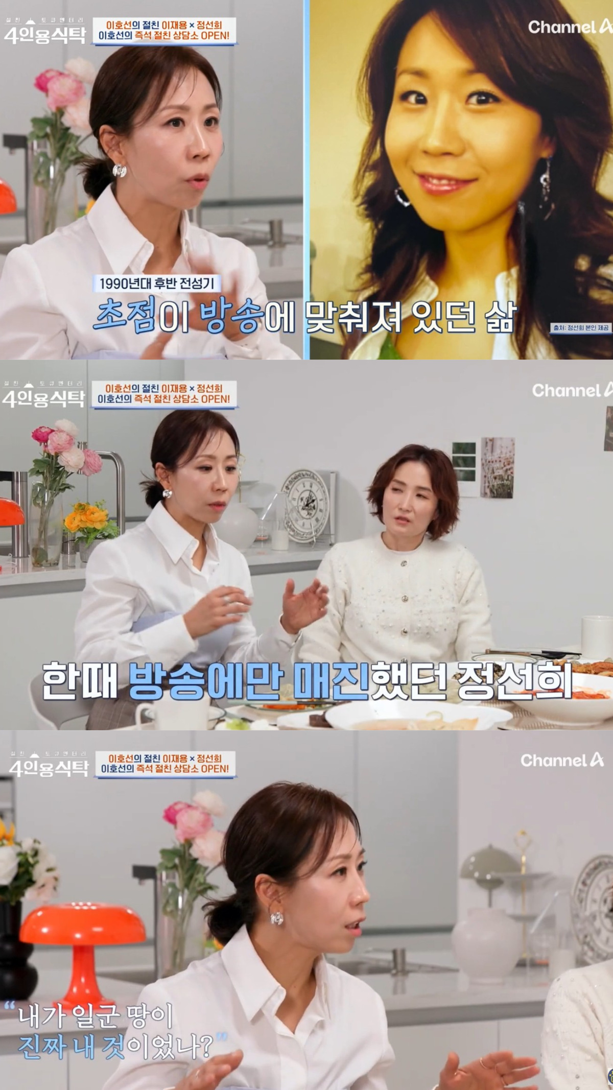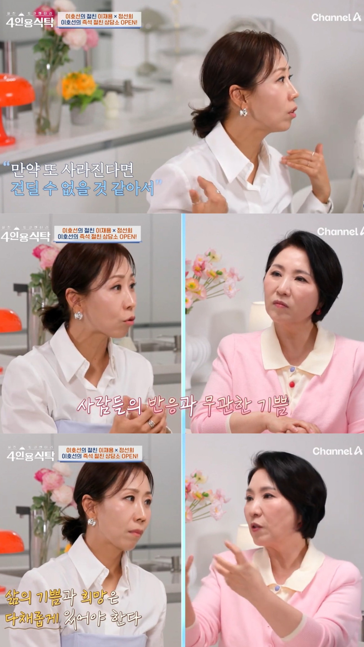 지난 22일 방송된 채널A ‘절친 토큐멘터리 - 4인용식탁’은 상담가 이호선 편으로 꾸려졌다. 이날 방송은 아나운서 이재용, 코미디언 정선희가 함께해 각자의 고민을 털어놓고 이호선 교수에게 상담을 받았다.