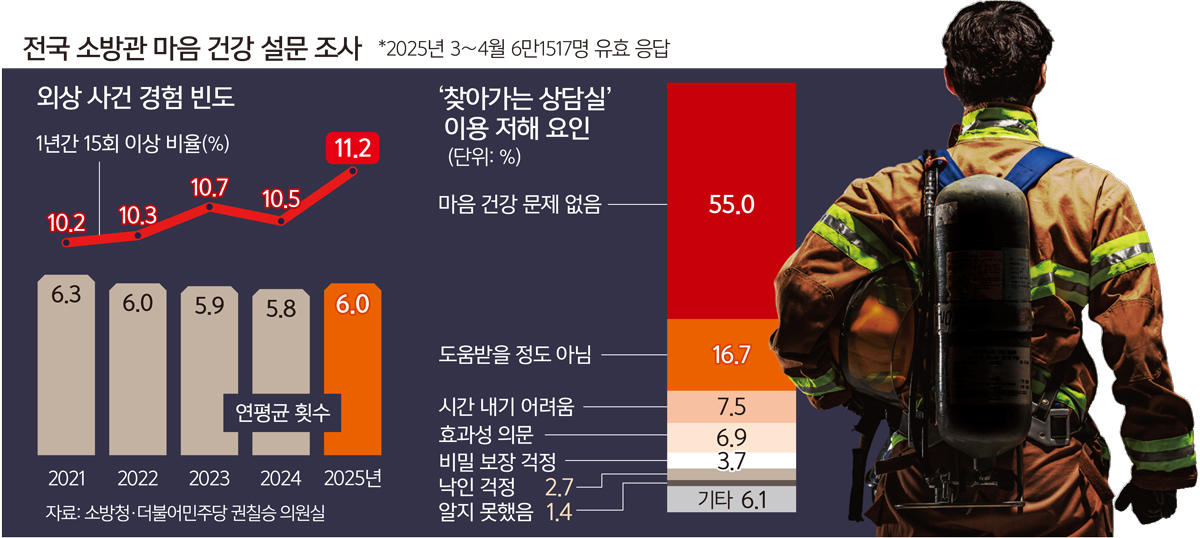 소방청이 올해 실시한 ‘소방공무원 마음 건강 설문 조사’에서 최근 1년간 외상 사건을 15회 이상 경험했다는 응답률이 5년래 최고치를 찍었다. 자살 같은 외상 사건을 많이 겪을수록 외상 후 스트레스 장애(PTSD)로 이어질 수 있는데, 정작 적잖은 소방관들이 자신의 마음 건강을 돌보는 데 소극적인 것으로 파악됐다.