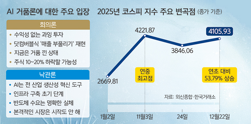 11월 들어 분위기는 급반전했다. 종가 기준 4200선(11월3일)까지 올랐던 코스피는 연일 2∼3% 하락장을 겪으며 3800∼3900선을 오갔다. 12월 들어선 AI 투자의 수익성을 가늠하는 지표로 여겨지는 클라우드 기업 오라클과 메모리 반도체 기업 마이크론 실적에 따라 테크주 회의론과 강세론이 부상하며 널뛰기 장세를 보였다. 이런 조정 흐름에는 AI에 대한 고평가 우려가 작용하고 있다. 핵심은 빅테크들이 AI 인프라 구축에 막대한 자금을 투입하고 있지만, 투입 대비 수익(ROI)이 이를 따라가지 못하는 ‘수익성 지체’가 발생하고 있다는 것이다. 투자업계에 따르면 구글, 아마존, 메타 등은 지난 9월 이후 약 130조원 규모의 회사채를 발행하며 자금 조달에 나섰다. AI 열풍으로 시가총액 1위에 오른 엔비디아 몸값은 약 4조6000억달러로, 미국·중국·독일을 제외한 모든 국가의 경제 규모를 넘어서는 수준이다.