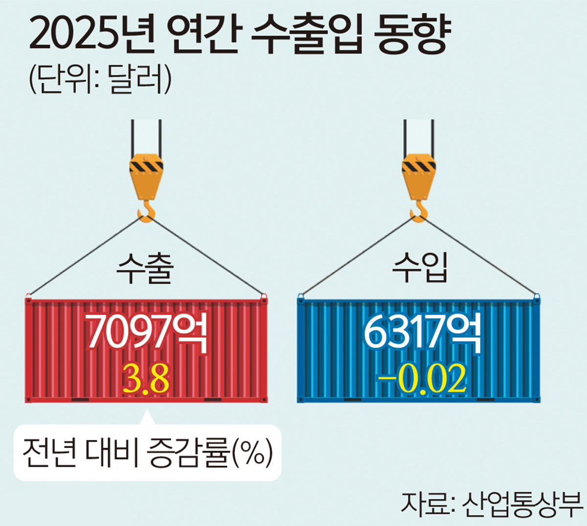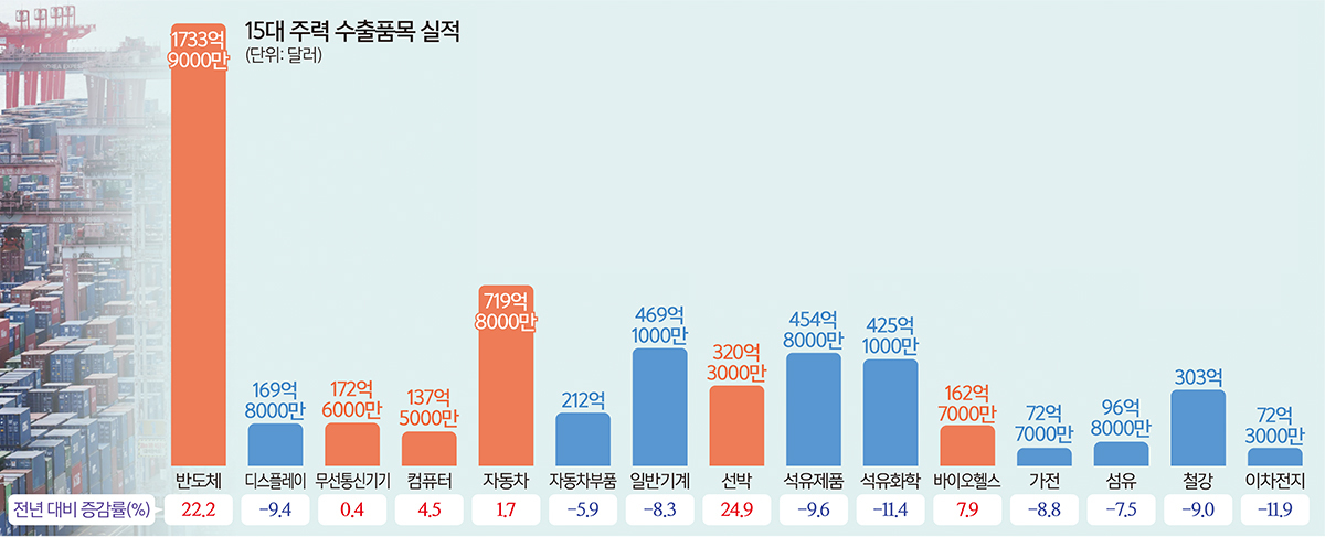1일 산업통상부가 발표한 지난해 수출 성과만 보면 박수쳐 줄 만하다. 그러나 15대 주력 수출 품목을 하나하나 들여다보면 마냥 환호할 수 없게 된다. 각각 전년 대비 22.2%와 24.9% 상승한 반도체(1733억9000만달러)와 선박(320억3000만달러), 대미 관세 장벽에도 불구하고 선전한 자동차(719억8000만달러) 등 일부를 제외하곤 상당수 업종이 고배를 마셨기 때문이다.