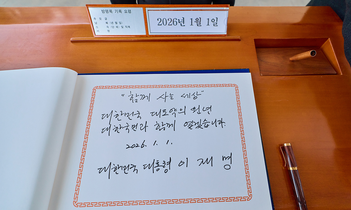 이 대통령은 이날 오전 국무위원 및 청와대 참모들과 국립서울현충원 참배로 새해 공식 일정을 시작했다. 이 대통령은 방명록에 “‘함께 사는 세상’ 대한민국 대도약의 원년 대한국민과 함께 열겠습니다”라고 서명했다.
