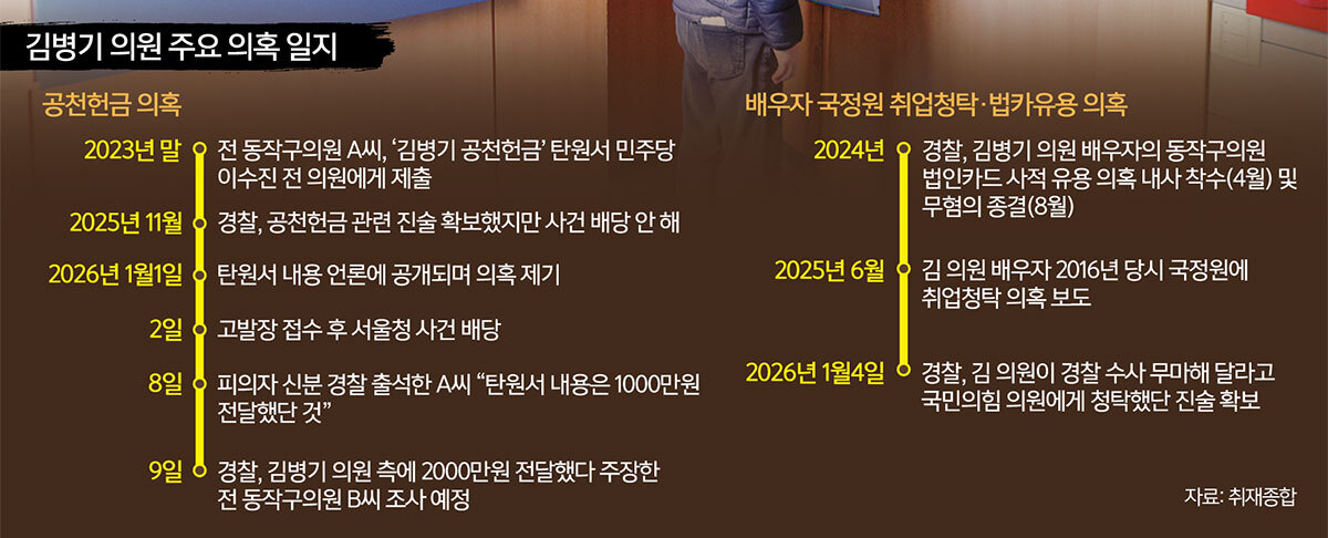 더불어민주당 김병기 의원의 공천헌금 의혹이 불거진 지 열흘이 지났지만 경찰 수사가 지지부진하다는 지적이 나오고 있다. 경찰 강제수사가 미뤄지는 사이 핵심 당사자들이 메신저를 탈퇴하거나 휴대전화를 교체하는 등 증거인멸 정황이 잇따라 포착됐기 때문이다. 앞서 서울 동작경찰서도 공천헌금 수수 내용을 담은 탄원서를 제출받았지만 두 달가량 방치하며 수사를 뭉갰다는 의혹이 있었다.