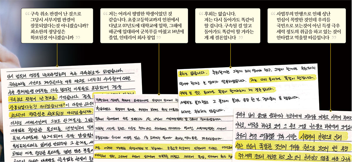 ‘서부지법 난동 사태’로 구속된 피고인들이 지난해 취재진에게 보낸 손편지 갈무리. 피고인들은 공통적으로 “군중심리에 휩쓸렸다”, “극우가 아니었다”면서도 “정당했다”, “극우로 몰아 억울하다”고 말했다. 한 피고인은 “구속될 걸 알고 돌아가도 똑같이 할 거라는 게 결론”이라고 했다.