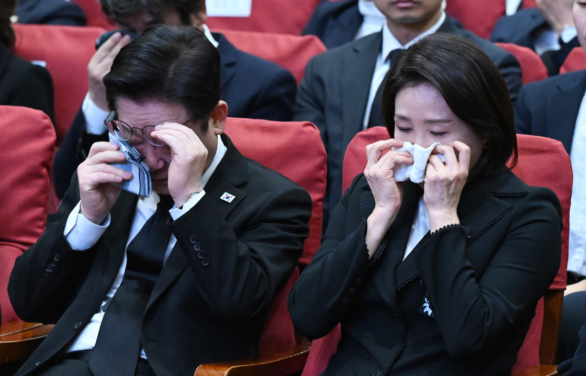 이 대통령 부부는 생전 업적 등이 담긴 추모 영상 시청하며 눈물을 흘리기도 했다.