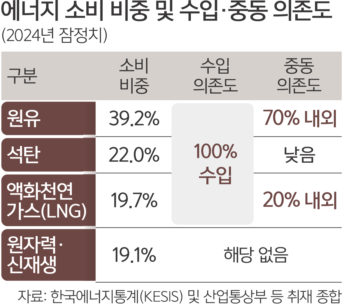 정부도 중동 사태 전개를 면밀히 주시하며 긴급 대응에 나선 상황이다. 기후에너지환경부는 이날 이호현 2차관 주재로 에너지 수급 점검 회의를 열고 중동 사태가 국내 원유·LNG 도입과 전력 수급에 미치는 영향을 점검했다. 기후부는 한국전력과 발전 5사 등 전력 공기업과 함께 ‘에너지비상대응반’을 가동해 중동 정세와 에너지 수급 상황에 대한 모니터링을 강화하기로 했다. 필요할 경우 비축유 방출과 대체 물량 확보 등 컨틴전시 플랜(상황별 대응계획)을 가동할 방침이다. 정부는 지난해 기준 비축유 1억배럴을 확보했고, 민간도 약 9500만배럴을 비축하고 있다. 국제에너지기구(IEA) 기준으로 일일 순수입량 대비 210일 이상 사용할 수 있는 물량이다.