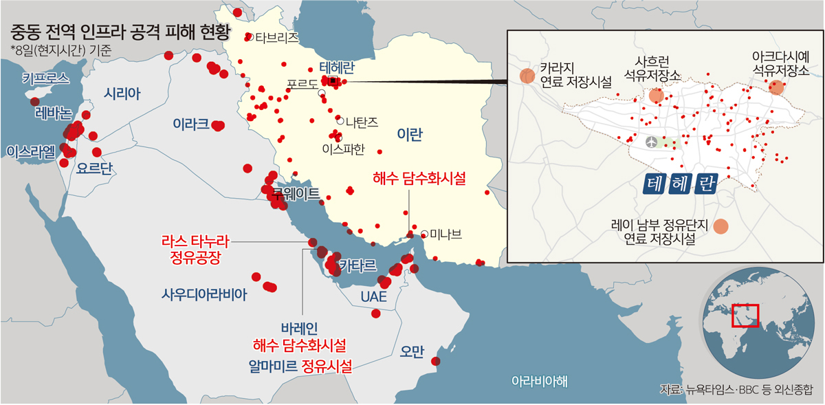 열흘째에 접어든 미국·이란 전쟁의 양상이 기존 군사시설 타격에서 인프라 파괴 형태로 급격하게 변화하며 유가 급등 등 후폭풍 우려가 커지고 있다. 심지어 담수화 시설 등 생존에 필수적 시설 등까지 공격하고 있어 인도적 위기 발생 가능성도 제기된다.