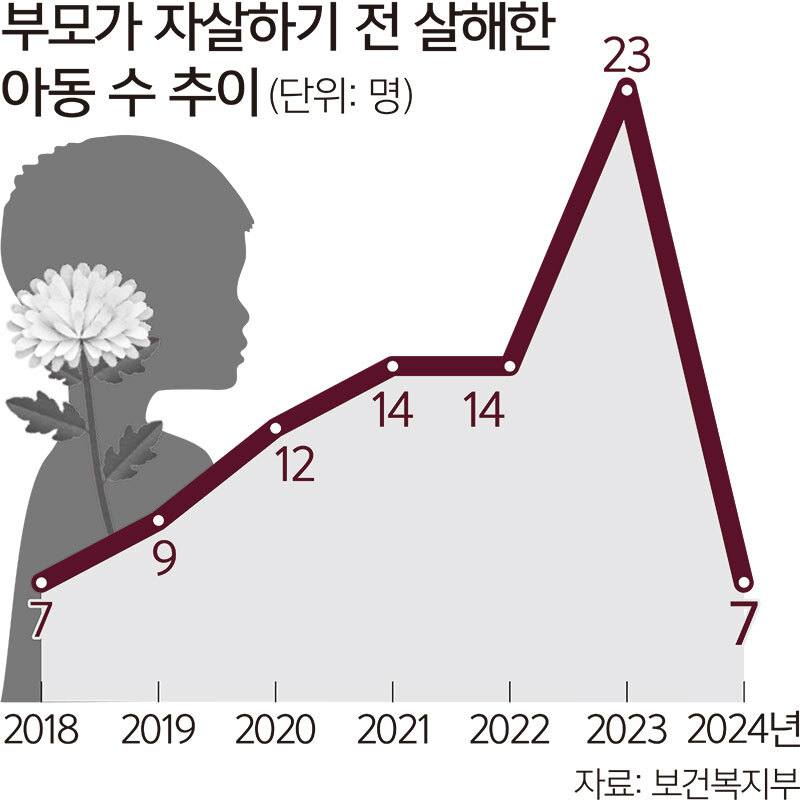 30일 보건복지부의 ‘아동학대 연차보고서’에 따르면 2018∼2024년 부모가 자녀를 살해한 뒤 자살해 사망한 아동은 86명으로 집계됐다. 연도별 피해 아동 수는 집계가 시작된 2018년 7명, 2019년 9명, 2020년 12명, 2021∼2022년 각각 14명이었으며 2023년 23명으로 최고치를 기록했다. 2024년은 7명으로 감소했다.