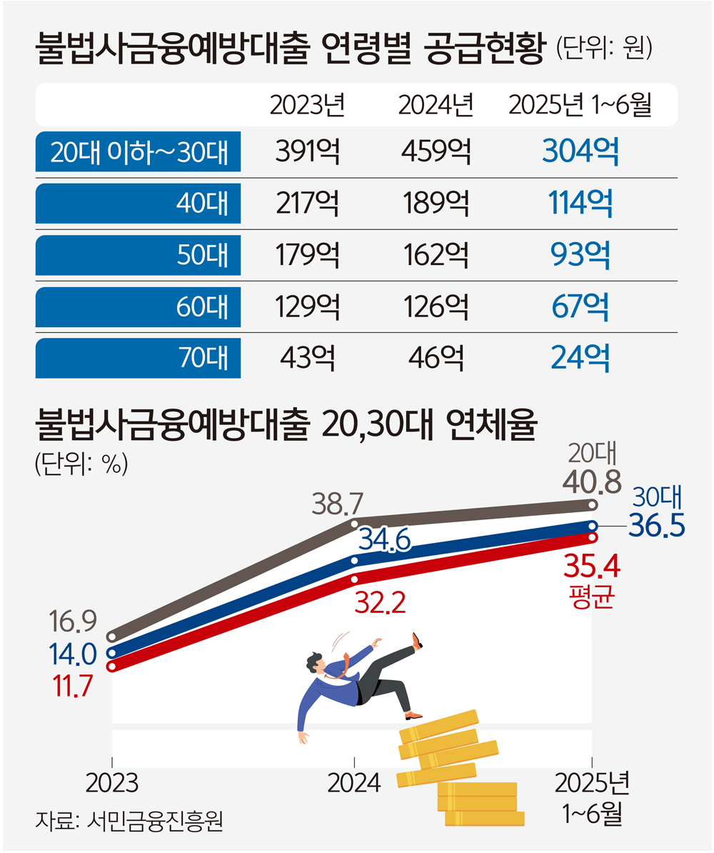 저신용 취약계층에게 최대 100만원을 빌려주는 ‘불법사금융예방대출(불사예대)’ 누적 대출액의 절반가량을 청년이 받은 것으로 나타났다. 연령대별 연체율도 청년층이 가장 높다. 고용 불황이 이어지며 구직을 포기하거나 실패한 청년들이 많아진 영향이란 지적이다.