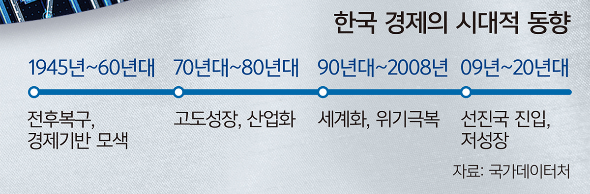 하지만 광복 80년을 맞은 한국 경제의 현주소는 성장보다 정체에 가깝다는 평가가 지배적이다. 경공업에서 중화학공업, 첨단기술산업으로 차근히 성장해 온 한국경제의 동력이 오늘날에는 뚜렷하게 보이지 않아서다. 여기에 저출산·고령화에 따른 내수시장의 위축, 통상 경제의 불확실성 고조와 같은 악재가 더해지며 미래 먹거리 발굴과 구조개혁을 서둘러야 한다는 목소리가 나오고 있다.