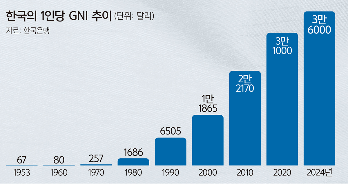 27일 국가데이터처 등에 따르면 한국의 명목 국내총생산(GDP)은 1953년 477억원에서 지난해 2557조원으로 5만3000배 성장했다. 국민들의 평균 소득수준을 보여주는 1인당 국민총소득(GNI)은 1953년 67달러에서 지난해 3만6000달러로 치솟았다. 2019년에는 인구 5000만명과 1인당 GNI 3만달러를 세계에서 일곱 번째로 달성하며 ‘5030클럽’에 가입하는 쾌거를 이뤘다.