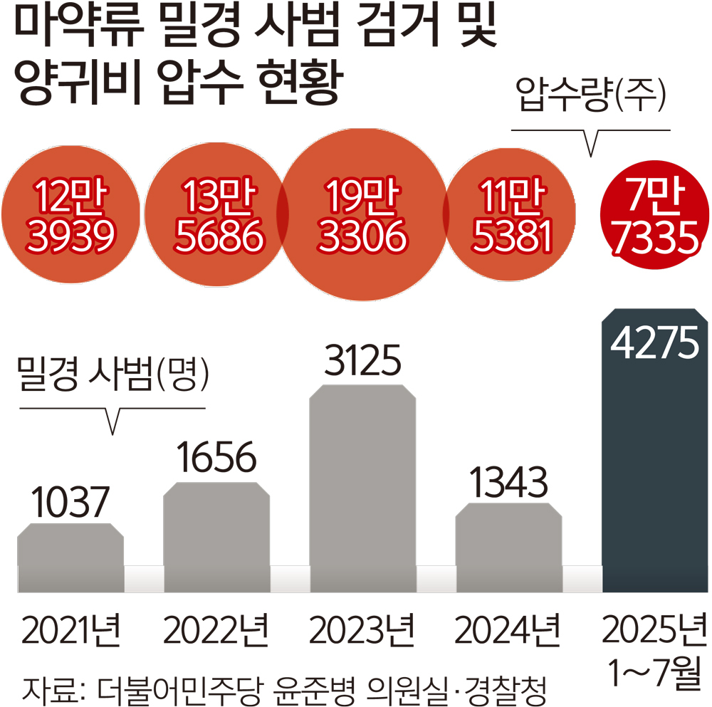 27일 경찰청이 더불어민주당 윤준병 의원에게 제출한 ‘유형별 마약류 사범 검거 현황’에 따르면 마약류 밀경 사범은 2020년 1037명에서 2021년 1656명, 2023년 3125명, 2024년 1343명, 올해는 7월 기준 4275명으로 집계됐다. 같은 기간 경찰이 압수한 양귀비는 총 64만5647주로, 해마다 10만주 이상 적발됐다.