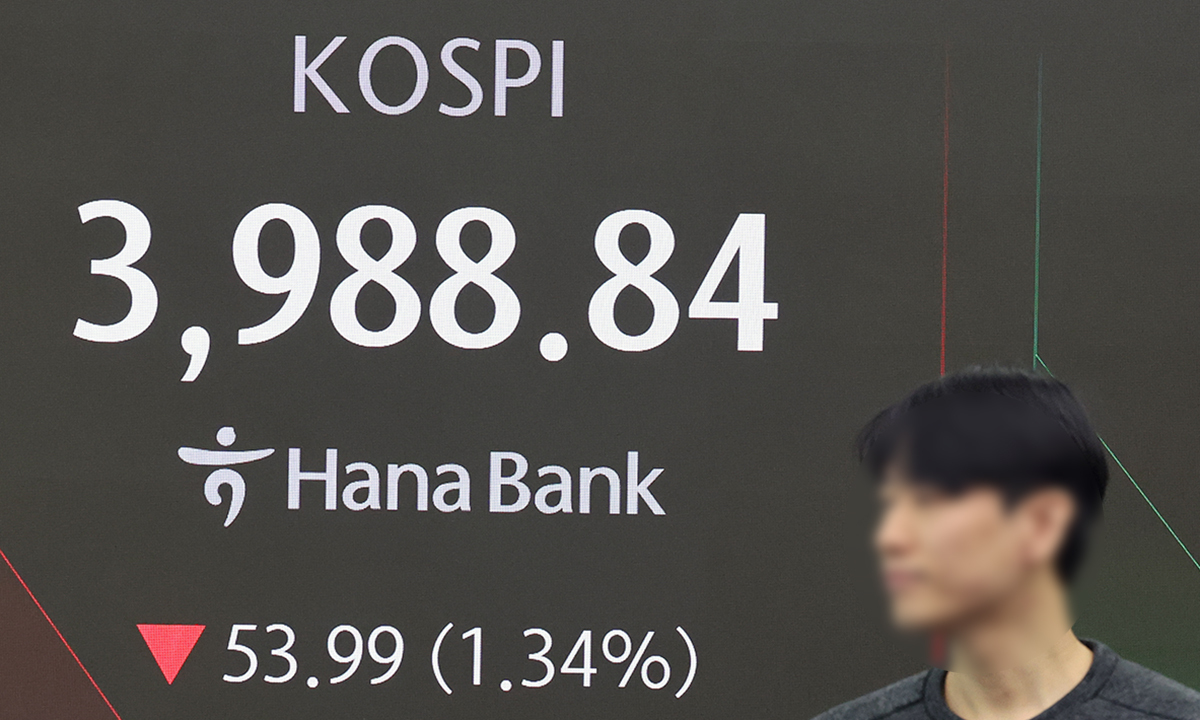 이날 오전 9시 32분 기준 코스피는 전장보다 53.29포인트(1.32%) 내린 3,989.54다.