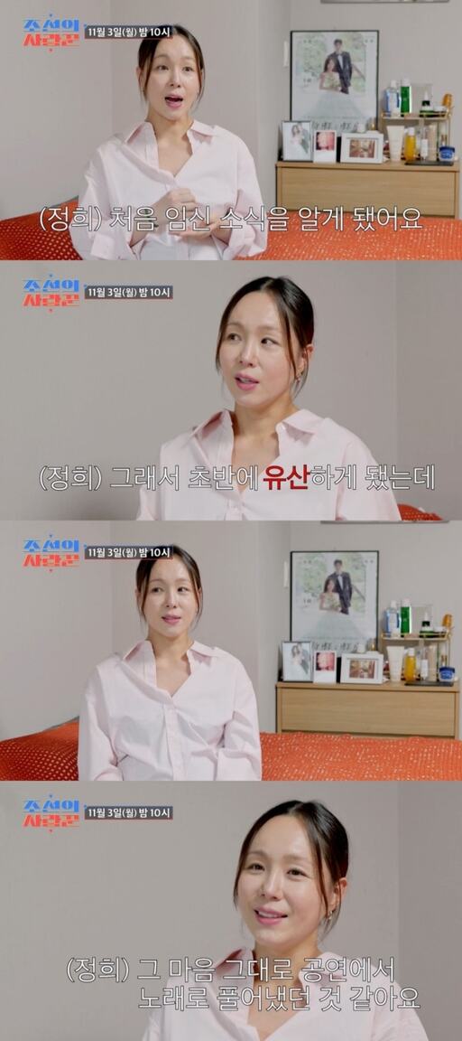 31일 공개된 선공개 영상에서 임정희는 "결혼하고 두 달 정도 됐을 때 처음 임신 소식을 알게 됐다"며 "그때는 준비가 안 돼 있어서 실감이 덜했다. 임신 초반에 유산했는데, 공연 일정 때문에 병원에 갈 수 없어서 수술도 못하고 무대에 올랐다"고 말했다.