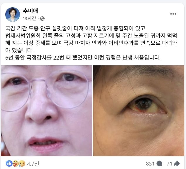 추 의원은 3일 자신의 사회관계망서비스(SNS)에 올린 글에서 “국감 기간 도중 안구 실핏줄이 터져 아직 벌겋게 충혈되어 있다”고 말했다.