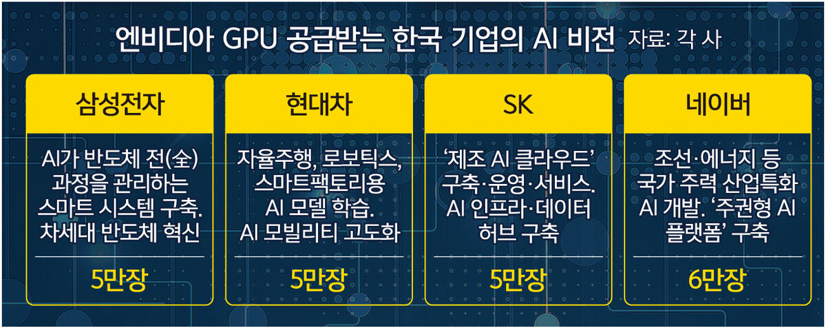 최근 폐막한 2025 아시아태평양경제협력체(APEC·에이펙) 정상회의를 계기로 성사된 엔비디아와의 파트너십 구축은 제조업 강국인 한국에 ‘AI 산업혁명’을 불러올 기폭제로 주목받는다. 엔비디아로부터 GPU를 공급받게 된 삼성전자·현대차·SK·네이버의 ‘AI 팩토리’가 산실 역할을 할 전망이다.
