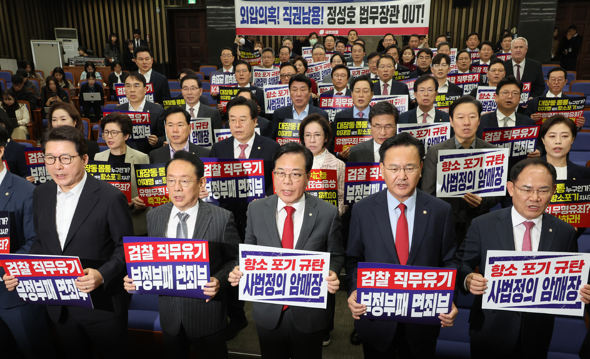 반면 국민의힘 송 원내대표는 “항소 포기는 공범으로 재판받는 (이 대통령의 측근) 정진상, 김용, 나아가 이 대통령의 범죄행위를 무죄로 만들기 위한 ‘빌드업’”이라고 비꼬았다. 같은 당 나경원 의원은 “정 장관과 노만석 검찰총장 권한대행(대검 차장검사)의 언급을 종합하면, 대통령실의 부당개입이 명백하다”며 “철저한 수사로 책임을 물어야 한다”고 촉구했다. 보수 성향 단체인 서민민생대책위원회는 전날 직권남용과 업무방해, 명예훼손 등 혐의로 정 장관과 노 대행 등에 대한 고발장을 서울경찰청에 제출했다.