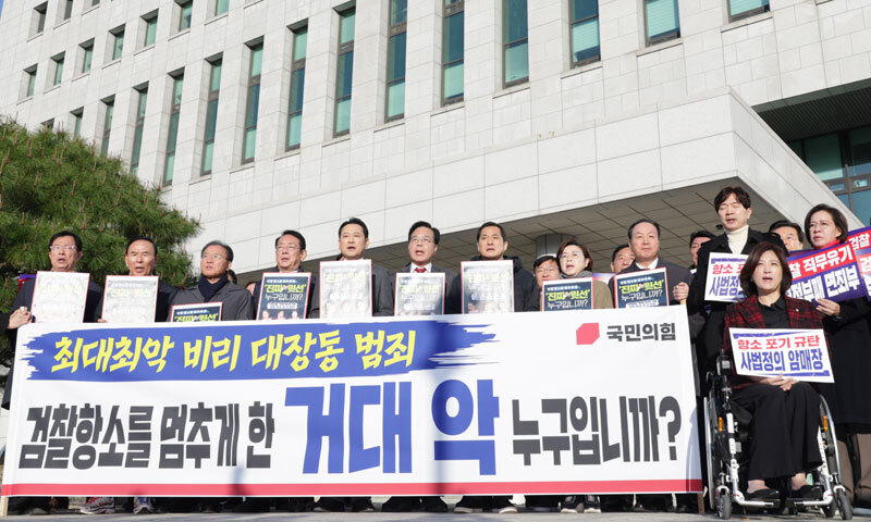 국민의힘 의원 40여명은 11일 오전 서초동 대검찰청 청사 앞에서 검찰의 대장동 사건 항소 포기 관련 규탄대회를 열고 노만석 검찰총장 직무대행의 사퇴와 국정조사 및 특검을 통한 진상 규명을 촉구했다.