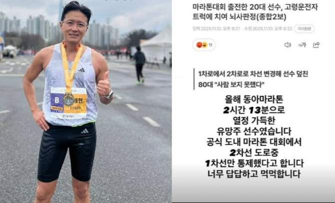 진태현은 지난 10일 자신의 사회관계망서비스(SNS)를 통해 이번 사고 관련 기사를 공유하며 “올해 동아마라톤 기록이 2시간 13분으로 열정 가득한 유망주 선수였다”고 밝혔다. 이어 그는 ”공식 도내 마라톤 대회에서 2차선 도로 중 1차선만 통제했다고 한다. 너무 답답하고 먹먹하다”며 안타까운 심정을 전했다.