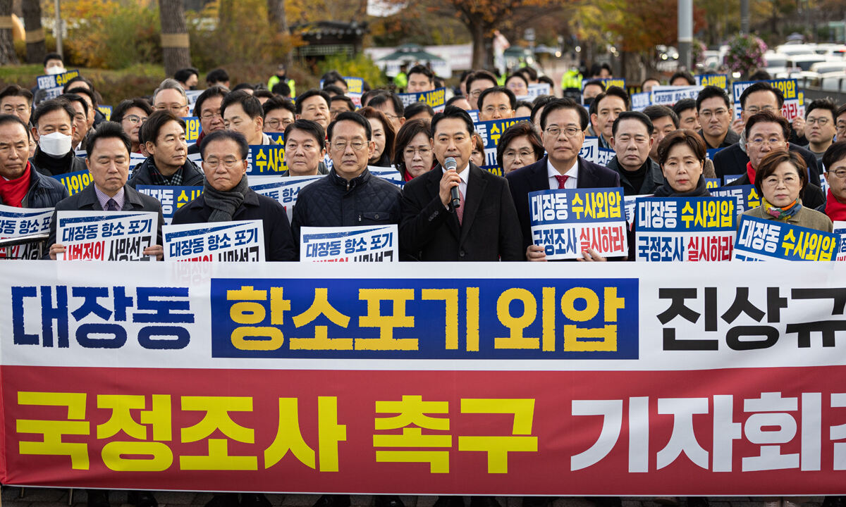 국민의힘은 17일 용산 대통령실 앞에서 기자회견을 열고 검찰의 대장동 사건 항소 포기를 규탄하고 국회 차원의 국정조사를 촉구했다.