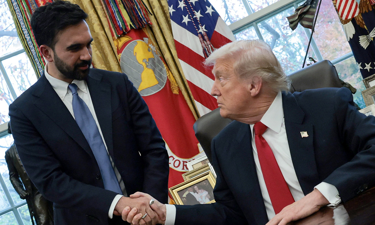 도널드 트럼프(79) 미국 대통령이 아들뻘보다 어린 조란 맘다니(34) 뉴욕시장 당선인과의 첫 대면에서 화기애애한 분위기를 연출했다. 둘 다 뉴욕이 고향이라고 하는 공통점 때문인지 서로를 향한 정치적 공격은 삼가며 물가 등 민생을 주제로 대화를 이어간 것으로 보인다.